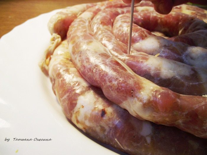 Если будете жарить в духовке на противне или форме — делайте большие кольца, поскольку переворачивать ее не понадобиться. Если же предпочитаете готовить на гриль-сковороде или на сетке — тогда лучше подготовить небольшие колечки колбасы. Их будет легко перевернуть в процессе обжарки. Каждую колбаску проколоть зубочисткой — это предотвратит кишку от разрыва при обжаривании.