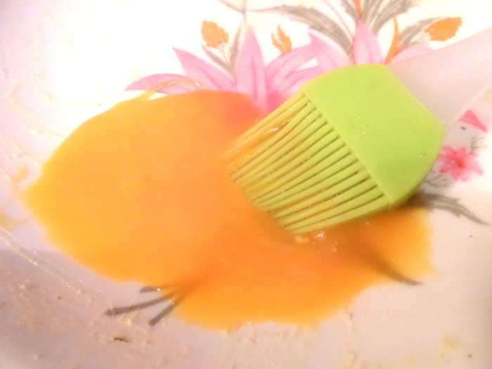 Желток отделить от белка и взбить вилкой или кисточкой.