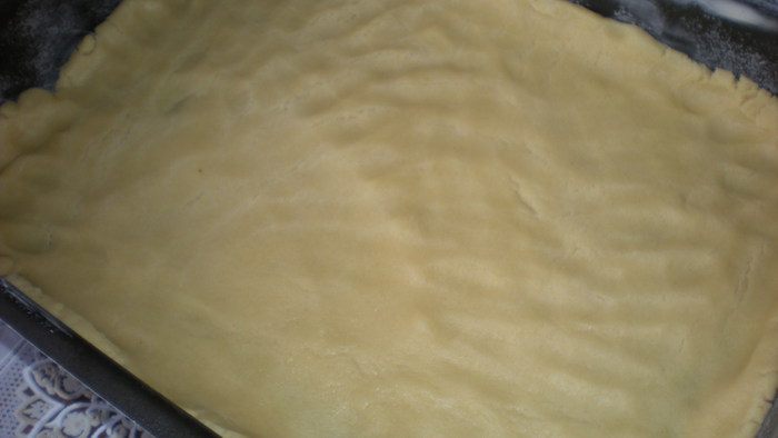 Большую часть выкладываем на дно и руками распределяем по дну. Небольшая хитрость: на тесто немного под начинку посыпаю крахмал, совсем чуть-чуть...Это для того, чтобы под жидким варением тесто не мокло )))