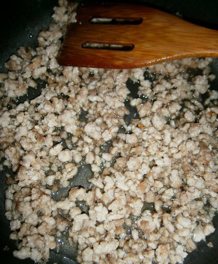 Фарш обжарить на небольшом количестве растительного масла в течении 2 - 3 минут.