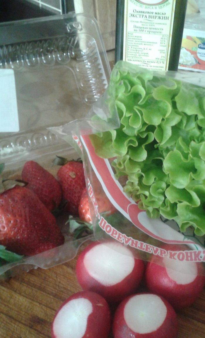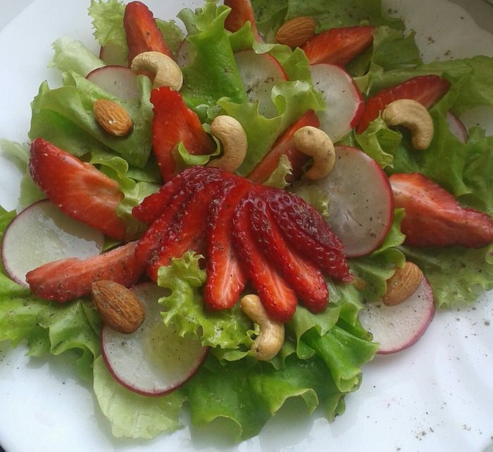 Лист салата, редис, клубнику выкладываем на тарелку, солим, перчим, посыпаем орешками и сбрызгиваем оливковым маслом. Очаровательный салат готов!