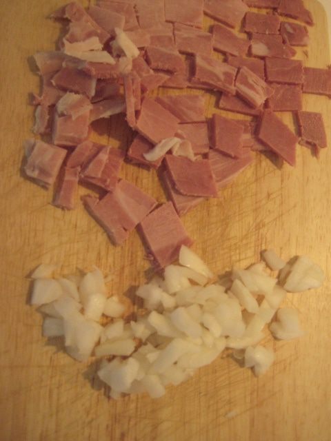 В сковороде разогреваем 2 ст. л. оливкового масла, обжариваем лук с ветчиной. У меня был молодой лучок, поэтому я его обжарила вместе с ветчиной, если обычный лук, то сначала обжарить лук, затем добавить ветчину.