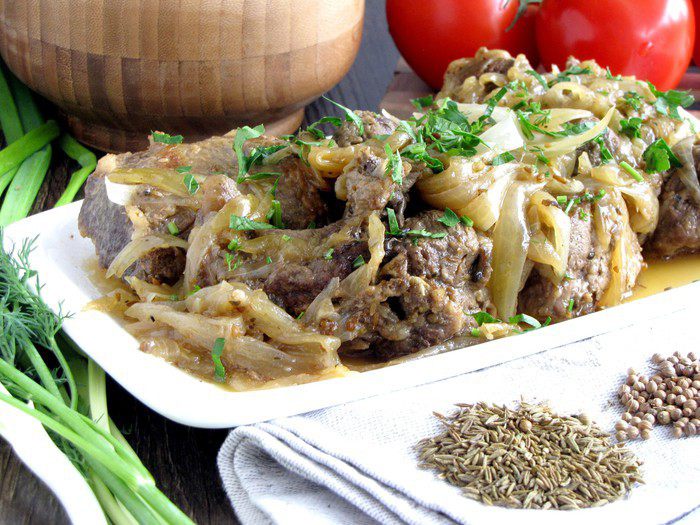 Готовое мясо перемешать и подавать на большом блюде, посыпав мелкорубленной зеленью. Приятного аппетита!