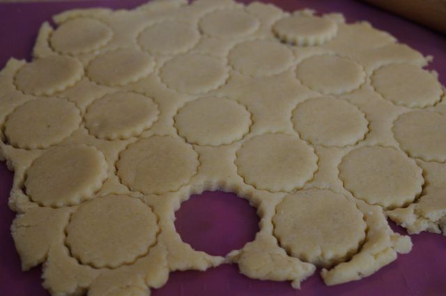 Раскатываем тесто в пласт толщиной ~4мм, вырезаем формочкой печенье; выпекаем на пергаменте около 15-20 минут при 175"С.
