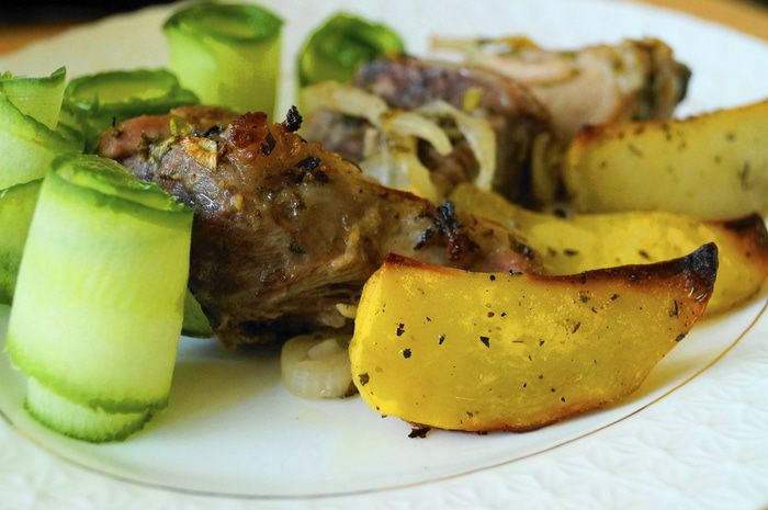 Не жирную свинину промыть, нарезать на небольшие кусочки (примерно, как для шашлыка), сложить в миску. Мясо посолить, поперчить, заправить растительным маслом и хорошо перемешать. Добавить измельченный чеснок, рубленную зелень петрушки, репчатый лук нарезанный кольцами. Выжать сок из лимона и заправить им мясо, хорошо перемешать и оставить мариноваться на 3 часа, можно дольше. Периодически мясо перемешивать.