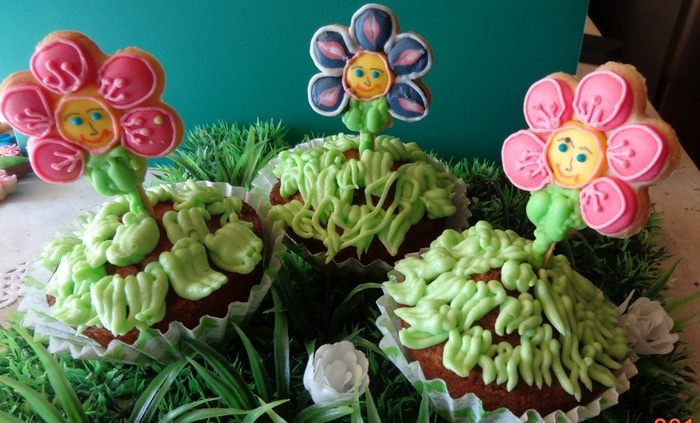 Приготовить тесто для кекса: масло комнатной температуры взбить с сахаром, по одному ввести яйца, продолжая взбивать, затем добавить муку с разрыхлителем и изюм с орехами. Перемешать. Выпекать в форме для кексов Д15 см и маффинов (у меня получилось 4 штуки) при 180 градусах минут 25-30. остудить. Срезать выпуклую верхушку. Залить верх растопленным шоколадом и украсить "травой" из масляного крема. Охладить. Так же украсить и маффины.
