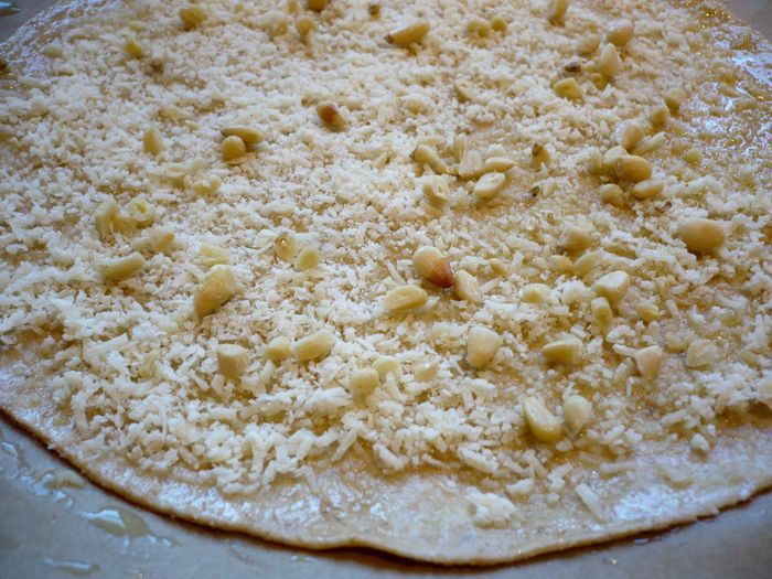 Затем достаем наш пирог, смазываем маслом верхний слой, на него укладываем начинку, т.е. пармезан, орешки, шпинат и помидоры, и снова закрываем смазанным маслом пластом теста. При этом помним, что сторона, смазанная маслом должна лежать на начинке. Снова ставим в духовку на 10 минут.