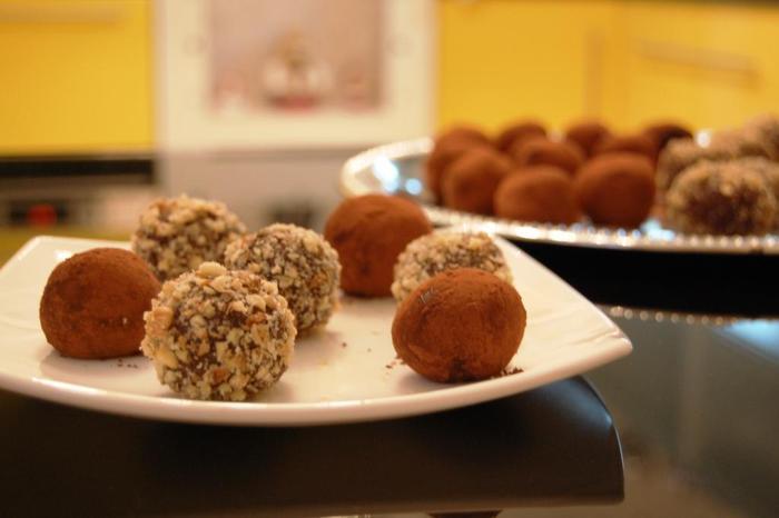 Из охлажденного теста скатываем шарики желаемого размера. По желанию, в половину трюфелей можно добавить орешек. (я добавляла фундук в те, которые в дальнейшем обваляла в какао)