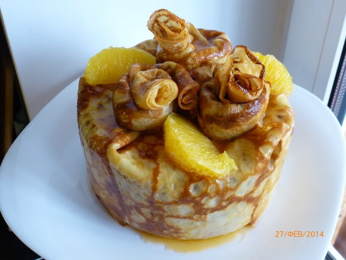 Готовим блины. Яйца растираем с сахаром, солью и мукой. Постепенно вливаем молоко, сливки и апельсиновый сок. Добавляем растопленное сливочное масло, еще раз все тщательно размешиваем. Готовое тесто убираем в холодильник на 1 час.