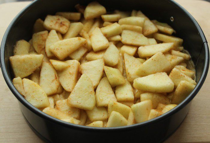 На яблоки выложить оставшееся тесто.