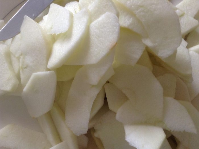 На половину лепешки равномерно положить яблоки и посыпать сахаром.
