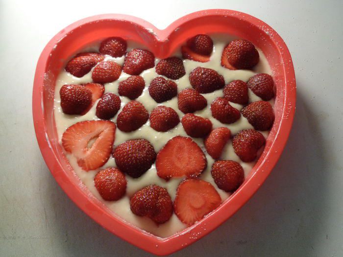 Сверху выложить оставшуюся часть теста, распределив по всей клубнике лопаткой.