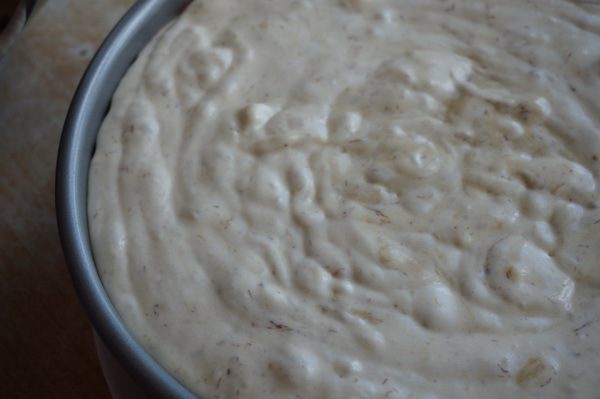 Вернемся к нашему бисквиту. Он уже давно остыл и немножко вылежался. Разрезаю его вдоль пополам. Ровненький, аккуратный, хорошо пропеченный (в разрезе), и, если бы он полежал еще с пол суток *отдыхая*, то и крошек бы не было в момент разрезания. Теперь кладем нижний бисквитный корж на блюдо, устанавливаем кольцо (бортик),выстилаем его кулинарной пленкой.