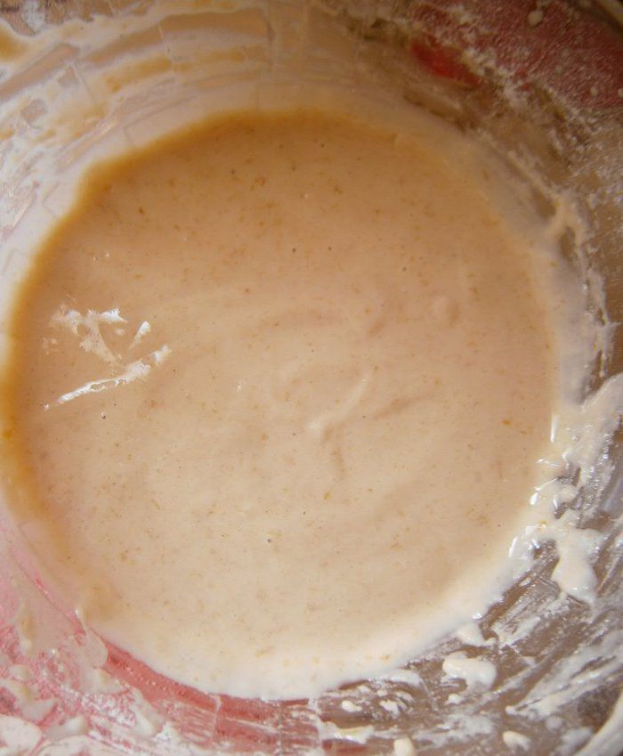 Йогурт, яйцо, соль, сахар и муку хорошо перемешать и взбить венчиком (миксером).