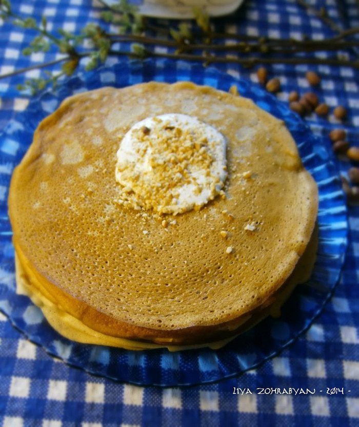 Раскалённую сковороду смазать растительным маслом и испечь тонкие блины.