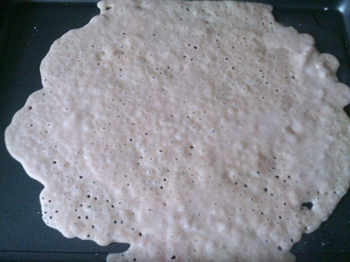 Сковороду хорошо разогреть, смазать немного растительным маслом. Налить тесто и распределить по поверхности.