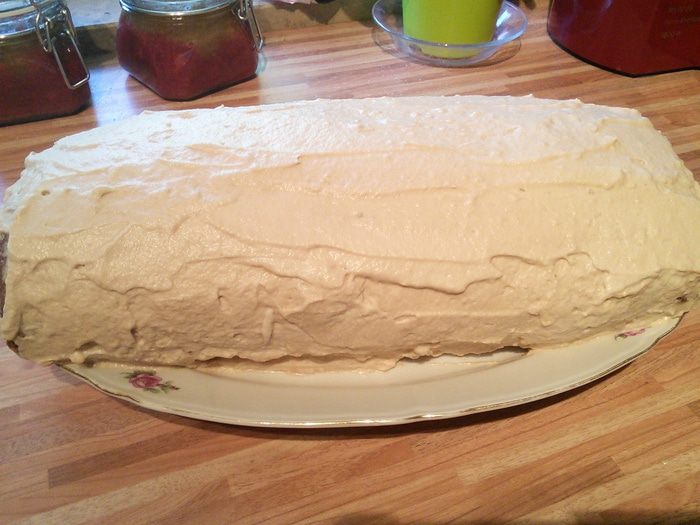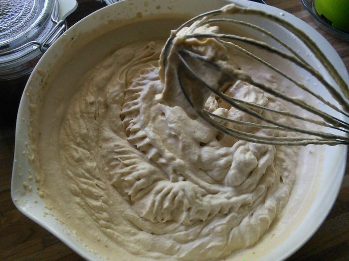Теперь займемся кремом: для этого взбить сливки, добавляя по немногу сахар, ваниль и капучино в порошке ( инстант). Замоченый заранее желатин выжать и растворить в чуточке воды на маленьком огне. Тонкой струйкой влить желатин в сливки и тщательно размещать. Теперь работаем быстро, т.к. крем начинает схватываться.