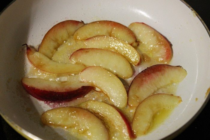 Займемся начинкой. Нагреваем сковороду, кладем масло, потом порезанные тонкими дольками нектарины, а сверху посыпаем сахаром. Обжариваем их по минутке с каждой стороны.