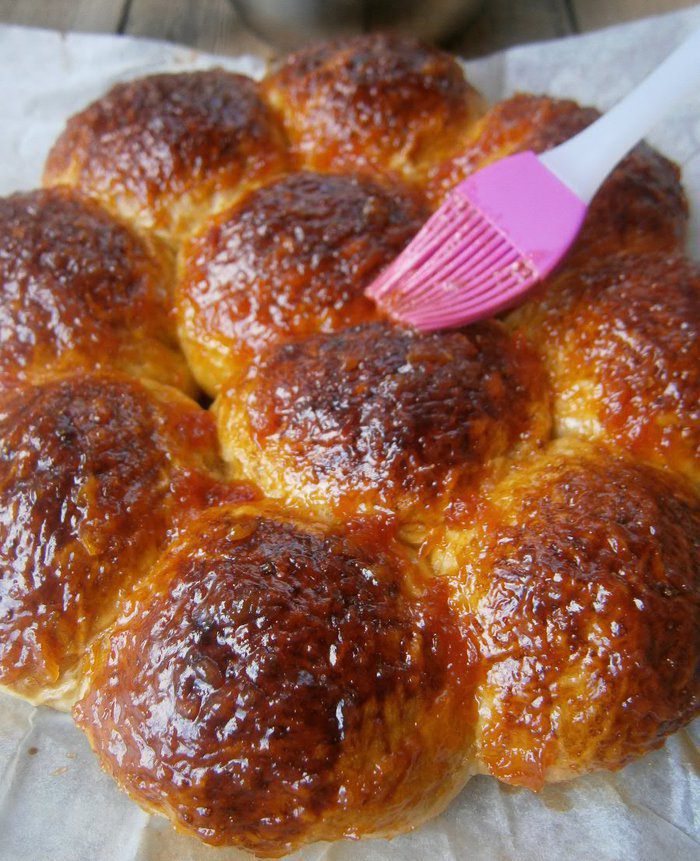 Горячие булочки смазать глазурью и дать остыть на решетке.