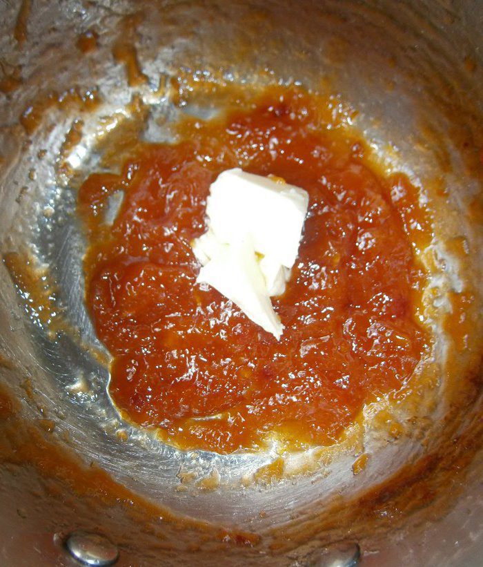 При помощи блендера измельчить в однородную массу. Снова поставить на огонь, добавить масло и дать ему полностью разойтись.