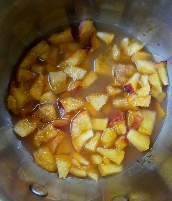 персики нарезать небольшими кусочками, сложить в сотейник. Добавить яблочный сок, лимонный сок, сахар, перемешать