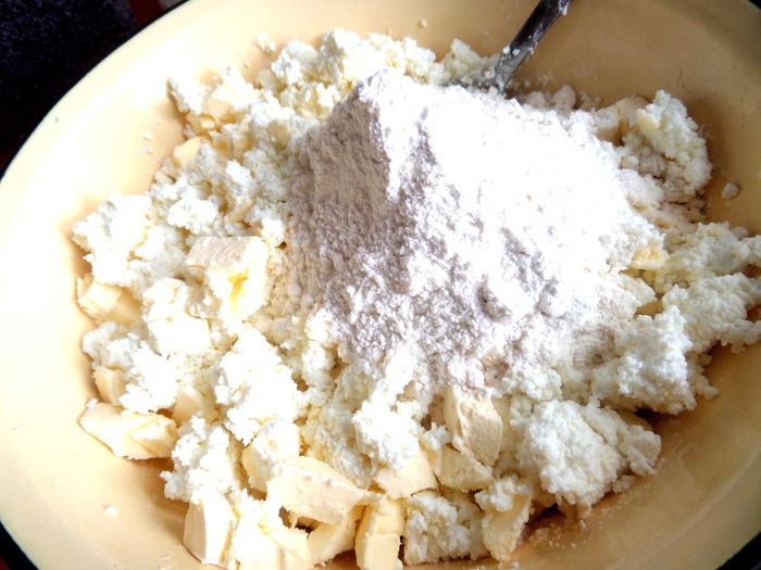 Далее замешиваем уже руками крутое тесто,досыпая муку,сколько тесто возьмёт...Всё зависит от влажности творога! Я написала максимальное количество муки,включая муку при лепке (на руки).