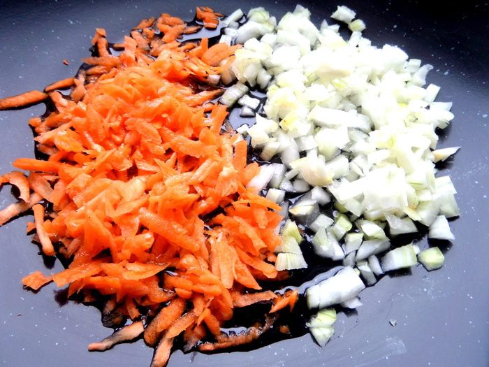 В это время можно начинать обжаривать лук, морковь (натертую на крупной терке).