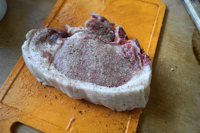 Свиные отбивные толщиной 1,5-2 см. натереть с 2х сторон солью и смесью перцев.