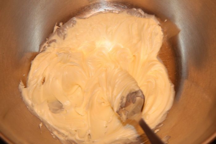 Размягченное масло слегка взбиваем вилкой или на медленных оборотах миксером, или венчиком.