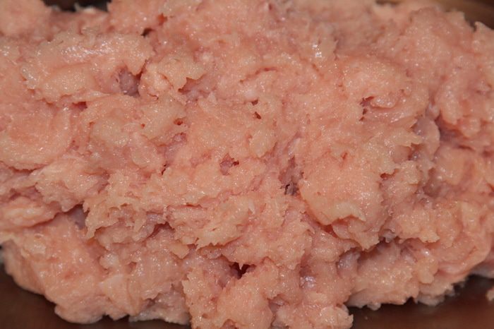 Куриное филе я пробила в чаше блендера на режиме "Пульсар" до получения однородной массы.