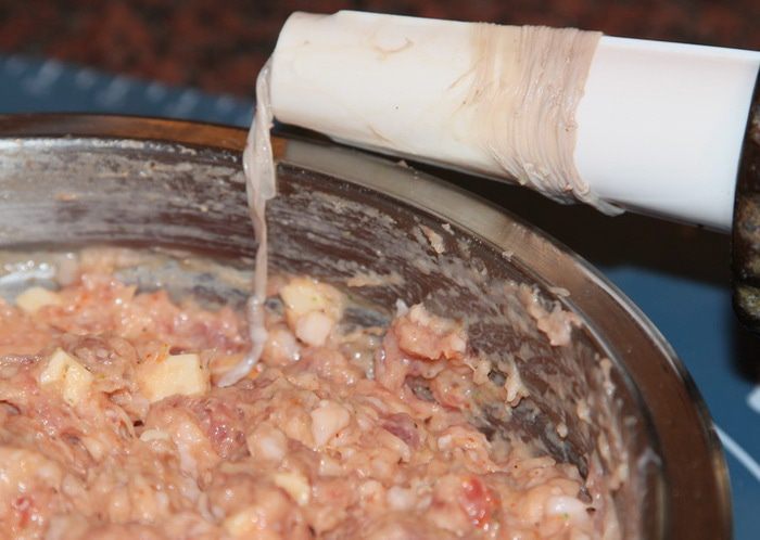 Начиняем череву фаршем. Получилось вот так совсем немало. Я забыла промерить сколько черевы у меня ушло, уж простите, пожалуйста...Но колбасы у меня получилось по весу ровно 2 кг. Это так, на всякий случай и для ориентира.