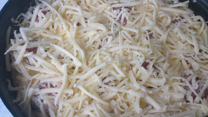 Форму для выпечки смазать любым маслом. Вылить тесто и равномерно распределить по тесту фрикадельки.