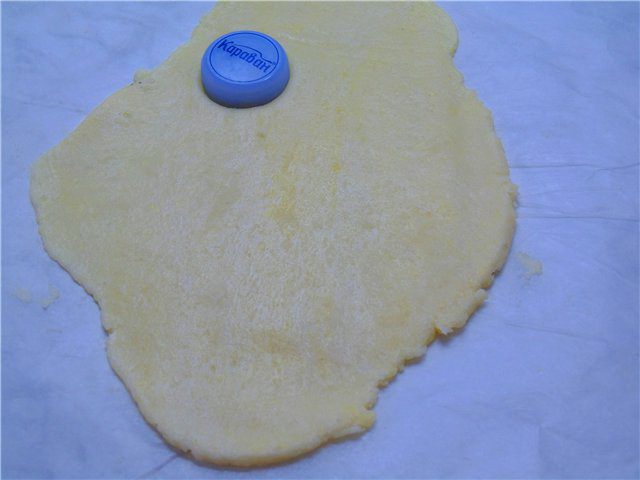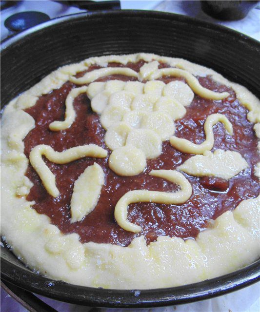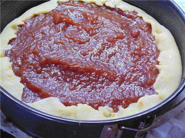 Песочное тесто: Просеянную муку смешать с сахарной пудрой (в оригинале 125 г, на мой взгляд достаточно 80 г) и солью. Добавить очень холодное масло, нарезанное кубиками и порубить в крошку. В мучную крошку добавить желток и воду. Быстро замесить тесто, которое скатать в шар, завернуть в пленку и поместить в холодильник на час.