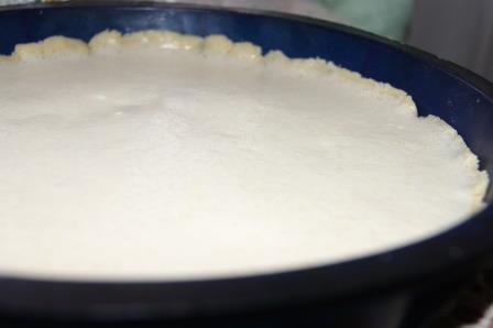 Готовим тесто. Смешать муку, соль, сахар. Добавить холодное масло, нарезанное кубиками. Перемешать до крошек, добавить воду, замесить тесто. Раскатать тесто, выложить в форму, убрать в холодильник на 20 минут.