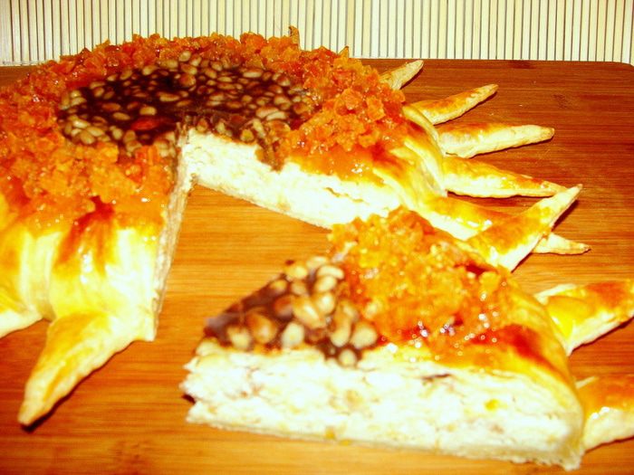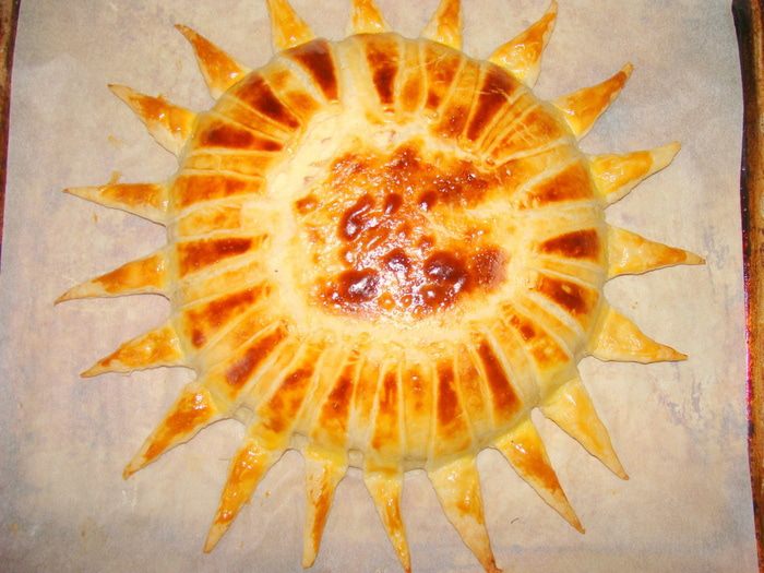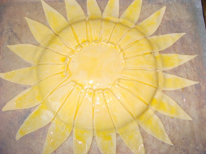 Смазать желтком. Поставить в разогретую до 180-200* духовку на 20 минут, потом я переключила на режим "гриль" и запекала еще 5-7 минут. Чтобы края лепесточков не подгорели, можно вырезать из фольги круг с дыркой внутри и накрыть их перед тем, как поменять режим выпекания. В одном случае я это делала, в другом нет. Разница была не очень большая, но без фольги, конечно края становятся суше и более темного цвета.
