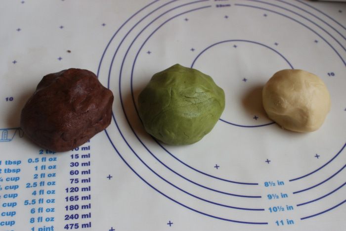 В одну часть мы добавим порошок зеленого чая. В другую какао. А меньшую часть оставим белой. Хорошо вымесим два наших теста.