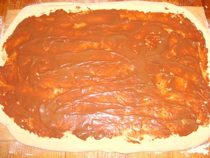 Дрожжи развести в теплой воде с 1 с/л сахара, дать подойти, добавить масло, муку, ванилин, оставшийся сахар, замесить тесто. Вымесить миксером 10 минут. накрыть, оставить в теплом месте. Когда тесто поднимется в 2-3 раза, обмять его и дать подойти еще раз. Разделить на две части, т.к. из этого количества получается 2 пирога. Выпекаются они в форме диаметром 26 см. Раскатать одну часть теста в виде прямоугольника толщиной 7-8 мм.