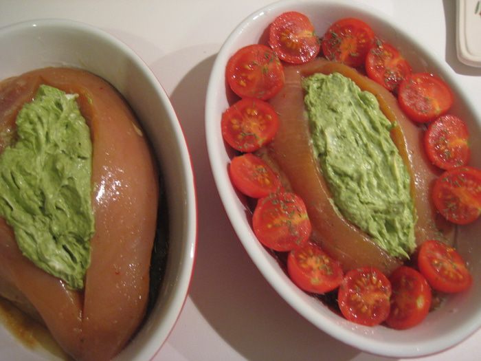 Форму смазать оливковым маслом, положить филе вместе с маринадом, влить вино. Зафаршировать начинкой, сбрызнуть оливковым маслом, посыпать сухарями и пармезаном.
