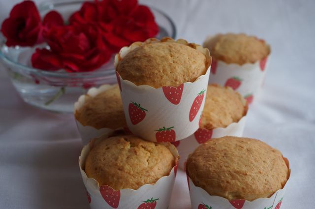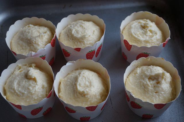 Из данного количества теста получается 8 больших, либо 12 маленьких кексов. На дно каждой формочки (здесь - одноразовые картонные) кладем по 1 или 2 (в зависимости от размера формы) столовой ложке теста, сверху - 0,5 чайной ложки сгущенки, четверть или половинку орешка.
