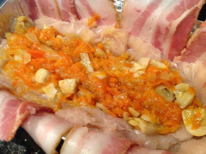 Накрыть концами бекона, избегая зазоров. Накрыть фольгой и выпекать в предварительно нагретой до 180 градусов духовке около 1 часа.