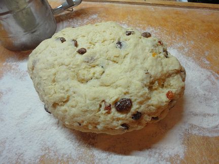 Масло растереть с сахаром. Добавить смесь сухих ингредиентов и изюм. Перемешать и, подливая молоко, замесить тесто. Долго не вымешивать, чтобы оно не затянулось. Да оно того и не требовало. Получилось очень мягко, к рукам не липло, приятное на ощупь.