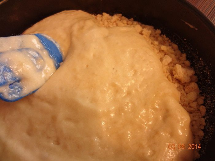 Затем выложить оставшееся тесто, на него остатки крошки, равномерно распределив их по поверхности. Отправить пирог в духовку на 50-60 минут. Если бортики вашей формы низкие, автор рекомендует поставить вниз пустой противень, т.к. пирог будет хорошо увеличиваться в процессе выпечки и верхний слой крошки может пересыпаться за край формы.
