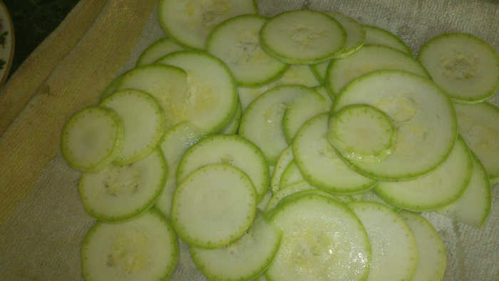Кабачок (кстати, цукини будет ничуть не хуже), режем тонкими кружочками, где-то по 1-2 мм толщиной, а там как получится. Можно воспользоваться каким-нибудь слайсером, но мне нравится просто ножом, так сказать "hand made")))