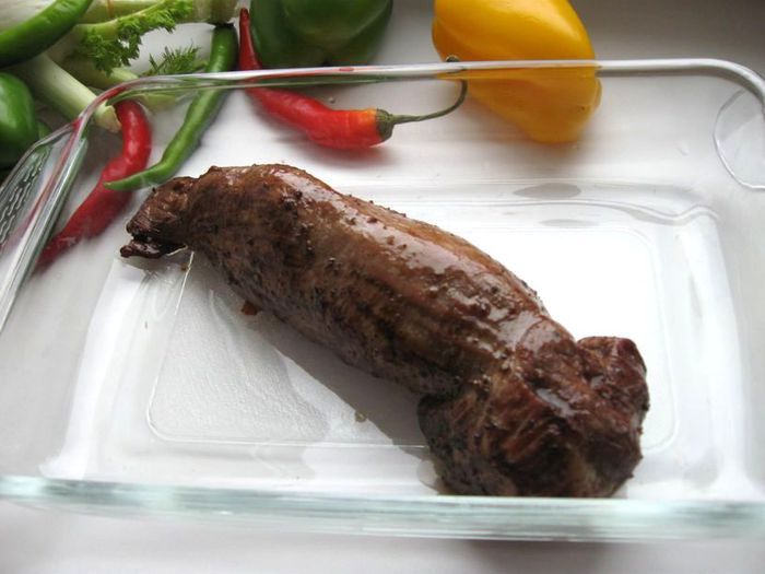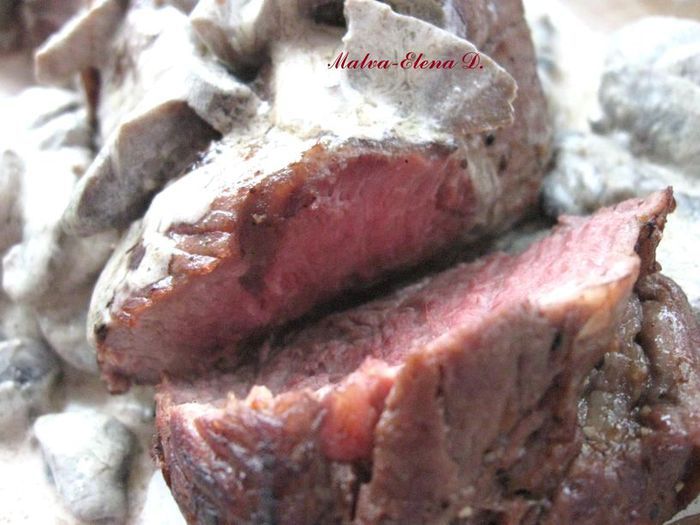 Вырезка требует деликатного обращения. Тогда она получается сочная, ароматная, тающая во рту, одним словом, отличная. Все это можно отнести к варианту, с которым я вас познакомлю. Несколько простых правил: перед приготовлением вырезку не мыть, перед жаркой она должна быть сухой и комнатной температуры, сковорода - с толстым дном. Определить, достаточно ли прогрелась сковорода можно, капнув каплю воды. Если сковорода нагрелась до нужной температуры, вода моментально испарится. Можно, как вариант, налить на сковороду растительное масло: оно должно начать совсем немного дымить. Не солить в процессе готовки. Посолите соус при приготовлении, поставьте соль на стол. Есть несколько методик – повышения и понижения температуры при запекании. Я воспользовалась более стандартной – небольшого понижения температуры. При высокой температуре происходит процесс карамелизации сахаров, содержащихся в мясе. Время нахождения в духовке зависит и от вида мяса, и от его веса, от заданной вами температуры, от способа подготовки мяса к этому процессу. И еще момент – не советую к грибам добавлять обжаренный лук, который как-то незаметно, но верно снижает тонкий аромат шампиньонов.