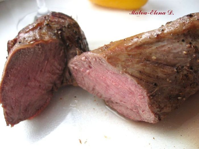 Поперчить мясо. В другой сковороде растопить 20 г сливочного масла. Когда образуется пена, положить мясо. Обжарить до красивого золотистого цвета со всех сторон. Переложить мясо в стеклянную или керамическую форму с толстым дном с низкими бортами, смазанную оливковым маслом. Поместить мясо в разогретую до 210 градусов духовку, через 10 минут понизить градус до 200 и запекать еще 10 минут. Вынуть из духовки.