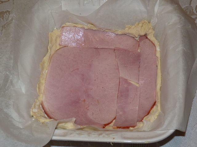 Жаропрочную форму застелить пекарской бумагой. Тесто выложить на дно, немного завернув бортики. Часть теста оставить для формирования бортиков. Выложить на тесто полоски ветчины, часть оставить для украшения.