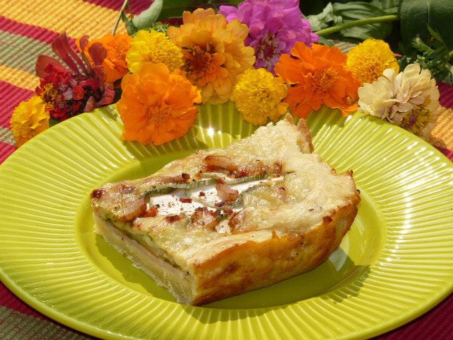 Один цукини нарезать тонкими пластинами и выложить сверху. Посолить.