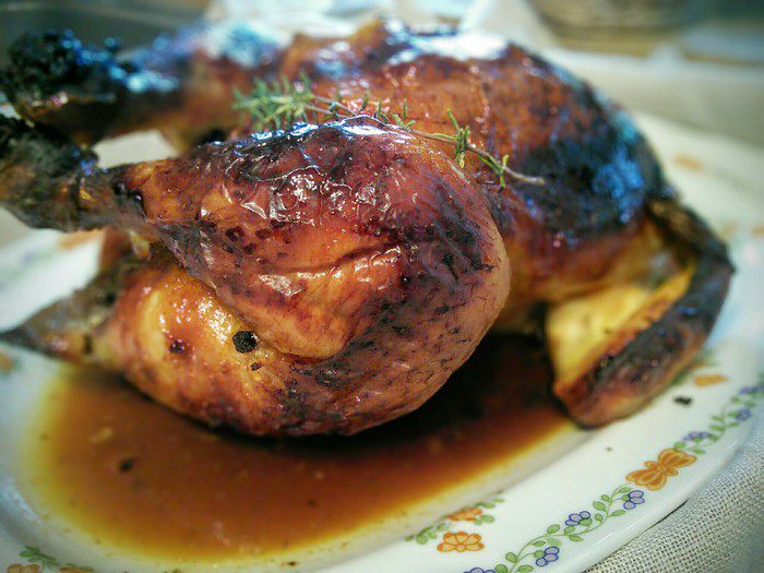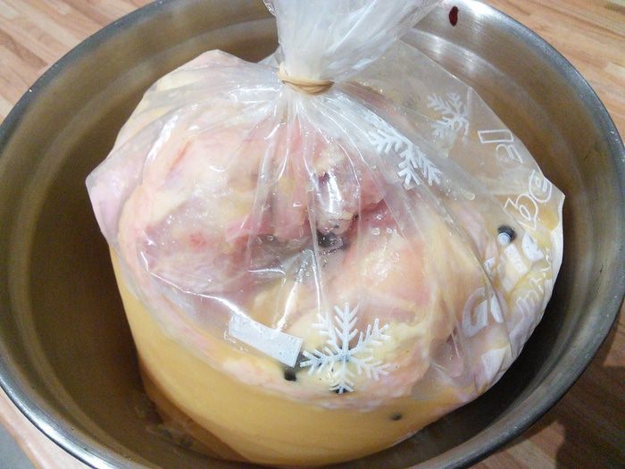 Курицу промыть, обсушить. Установить «насест»: в миску поместить плотный полиэтиленовый пакет, в пакет положить курицу, залить апельсиновым соком, добавить 3 — 4 ст. л. соли и горошины перца. Не бойтесь добавить столько соли, курица возьмет столько, сколько ей нужно.