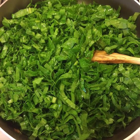 Добавить шпинат, соль, перец и тушить минут 10-15, пока не выпарится жидкость.