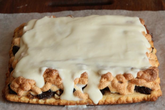 Пляцок называется «Пани КаблУчкова» с ударением на букву «У». Пекут у нас его на свадьбы, на крестины, на Рождество и — просто так. Например, в мой недавний приезд в Закарпатье, специально для меня его испекла моя добрая подружка Марьяна. Зная, что есть я не буду, но — испекла. Пришлось небольшой кусочек все-таки отведать, чтобы не огорчить подругу...Мдааа...А потом пришлось забирать весь потому как — испечен же для меня.